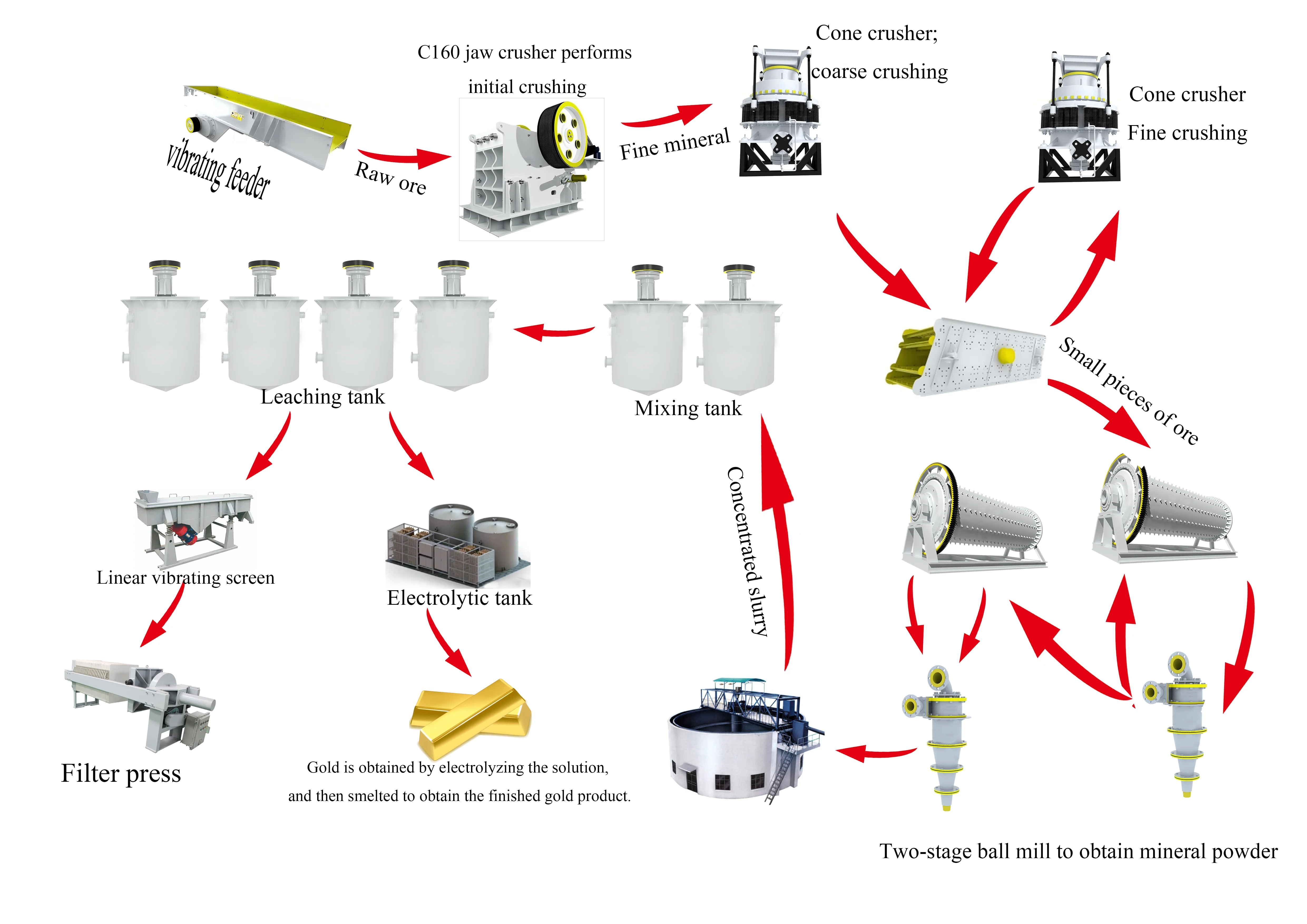 The jaw crusher features a heavy-duty welded steel frame with key components made of wear-resistant alloy materials, ensuring strong impact resistance and long-term operation in mining and mineral processing applications. Based on a compression crushing principle, it provides a large crushing ratio and stable capacity for primary crushing of various ores and rocks. The discharge size can be easily adjusted to meet different production requirements. Commonly used as the primary crusher in crushing or gold processing lines, it works smoothly with downstream grinding and separation equipment, offering reliable performance and easy maintenance.