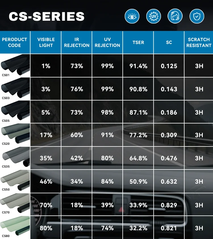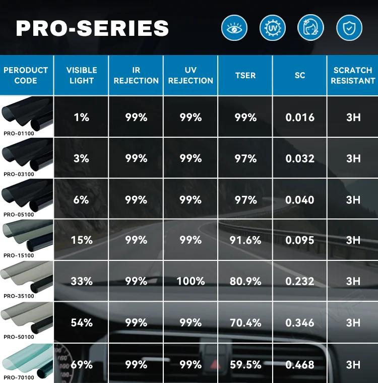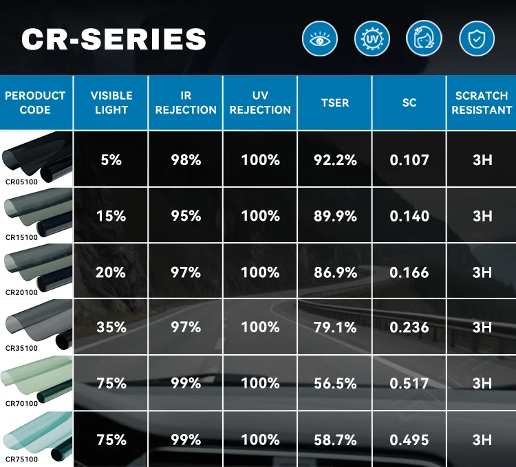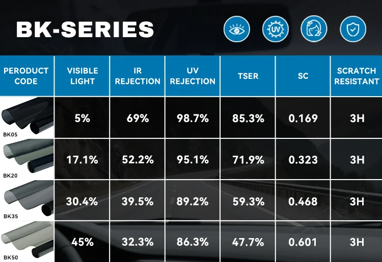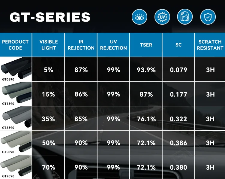 VLT Available:Different series is available in 1%, 3%,5%, 15%, 20%, 25%,35%, 45%, 55%,65%, 70%,75%, 80%, with different tint shade colors, charcoal,Smoke Black, Gray,Green Shade. Charcoal nano carbon tint shade and nano ceramic tint shade color.