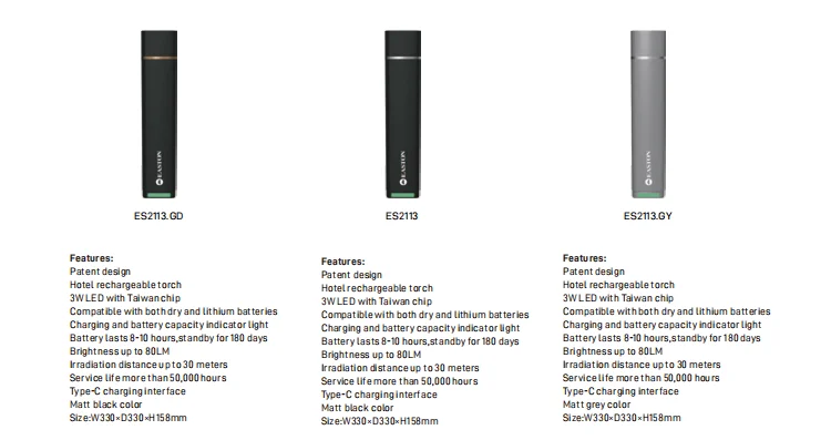 Patent design Hotel special rechargeable troch 3W LED lamp with Taiwan chip Compatible with both dry and lithium batteries Charging and battery capacity indicator light Battery lasts 8-10 hours,standby for 180 days Brightness up to 80LM Irradiation distance up to 30 meters Service life up to 50,000 hours Type-C charging interface Matt black color with gold chrome ring Without including battery Size:W330 x D330 x H158mm